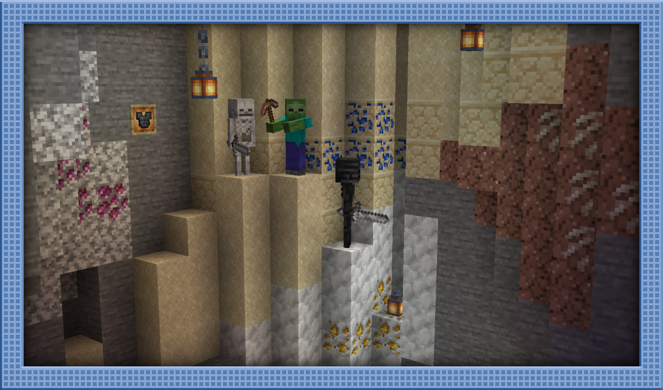 Various ores in various stone types alongside various mobs with various variant tools.